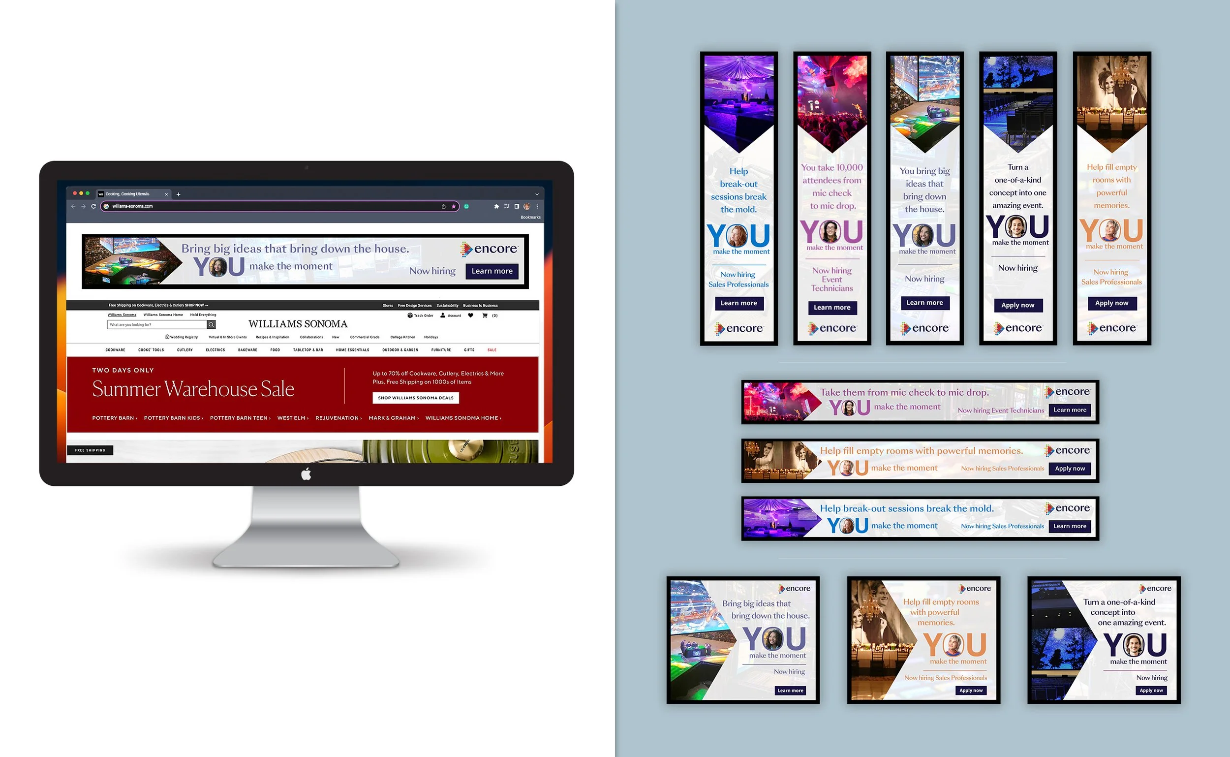 Challenge: Encore Global, a hidden gem as an employer, offers stable careers and growth opportunities for event creatives. The exciting events that candidates could be a part of - or create - made it a rare opportunity. Unfortunately, hard-to-fill production roles remained unfilled due to a lack of brand awareness. For the rebrand and small creative ask, the materials needed to be created in multiple languages.
